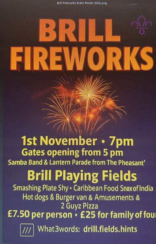 Nov 1 5:00 pm - 7:30 pm Brill Fireworks 2025 Brill Playing Fields Church Street, Brill Event Details Get Directions